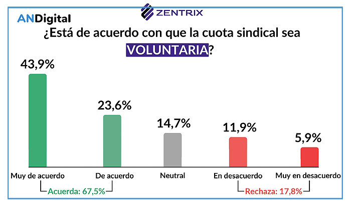 La misma encuesta muestra que el 67,5 % de los argentinos está a favor de transformar los aportes sindicales obligatorios en voluntarios, mientras que más del 82 % no se opone a eliminar la obligatoriedad. La percepción dominante es que el sistema actual funciona como un descuento compulsivo sin control ni justificación clara, aplicado como un impuesto al trabajo, es decir una recaudación parafiscal cuyo destino es incierto. En este contexto, se entiende que crecientes sectores sociales demanden un esquema basado en consentimiento individual y mayor transparencia, como condición mínima para legitimar el financiamiento sindical.