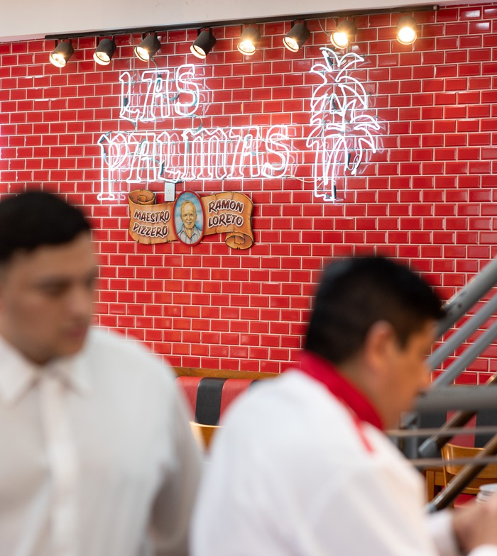 Las Palmas tiene una peculiaridad, seguramente es la única pizzería en el país que cuenta con dos hornos empotrados, uno sobre el otro, pero con los frentes ubicados en paredes contiguas. Para acceder al horno superior hay que desplazarse de costado y subir una escalera, una disposición tan singular como funcional, que permite elaborar más de 500 pizzas por noche.