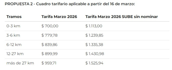 Según el cuadro tarifario propuesto, el boleto mínimo de colectivo en los servicios de jurisdicción nacional tendría un valor de $ 650 –desde el 17 de febrero luego de la consulta pública-, y de $ 700 -desde el 16 de marzo-.