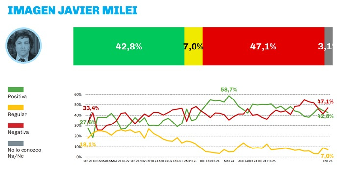 El líder libertario ostenta una imagen positiva de 42,8 %, en tanto que la negativa alcanza el 47,1 %; un 7 % de regular y unm 3,1 % de desconocimiento.