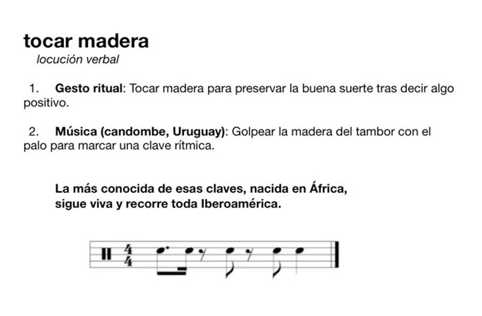 El artista presenta el juego de palabras entre las dos acepciones de “tocar madera”. Por un lado, el ritual de tocar madera, universalmente empleado para no tentar al destino. Además, en el candombe uruguayo, “tocar madera” se refiere a golpear la madera del tambor con el palo para marcar la clave rítmica.