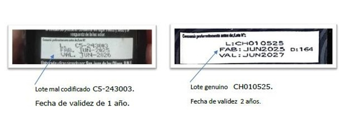 Se trata de botellas de 500 ml identificadas con el lote L. C5-243003, FAB. JUN-2025, VAL. JUN-2026 que la propia empresa confirmó que son productos falsificados.