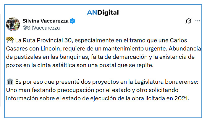 Según expuso en el proyecto, la Ruta Provincial 50, especialmente en el tramo que une Carlos Casares con Lincoln, requiere de un mantenimiento “urgente” ante la “abundancia de pastizales en las banquinas, falta de demarcación y la existencia de pozos en la cinta asfáltica”.