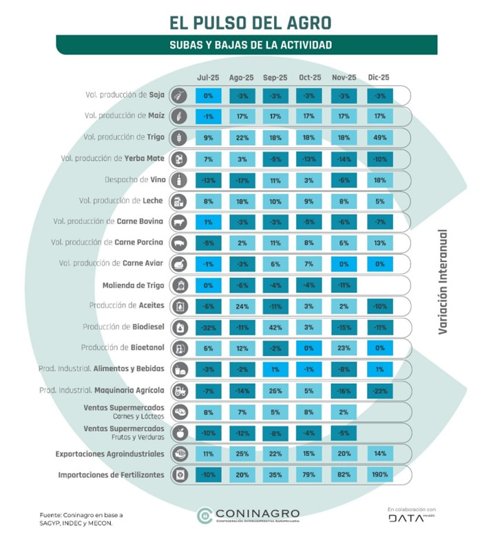 Así las cosas, el monitor de actividad elaborado por la Confederación Intercooperativa Agropecuaria (Coninagro) dio cuenta que de las 19 variables de actividad económica agropecuaria y agroindustrial relevadas, ocho registraron variaciones interanuales negativas, una menos que en noviembre.