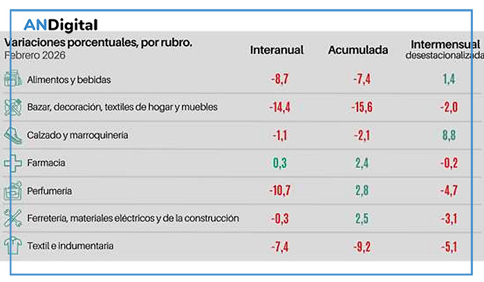En febrero el sector minorista pyme registró un descenso del 5,6 % interanual a valores constantes, aunque la variación mensual evidenció un incremento del 2,6 %, cifras con las que el indicador acumula una retracción del 5,2 % en lo que va del año 2026.