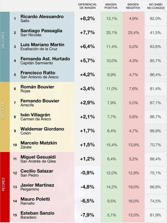 Los tres intendentes de la Segunda Sección electoral con mejor diferencial de imagen a nivel seccional son Ricardo Alessandro (Salto), quien se ubica en el primer lugar con un diferencial de +8,2 puntos porcentuales; seguido por Santiago Passaglia (San Nicolás), con +7,7 puntos; y en tercer lugar Luis Mariano Martín (Exaltación de la Cruz), con un saldo positivo de +6,4 puntos.