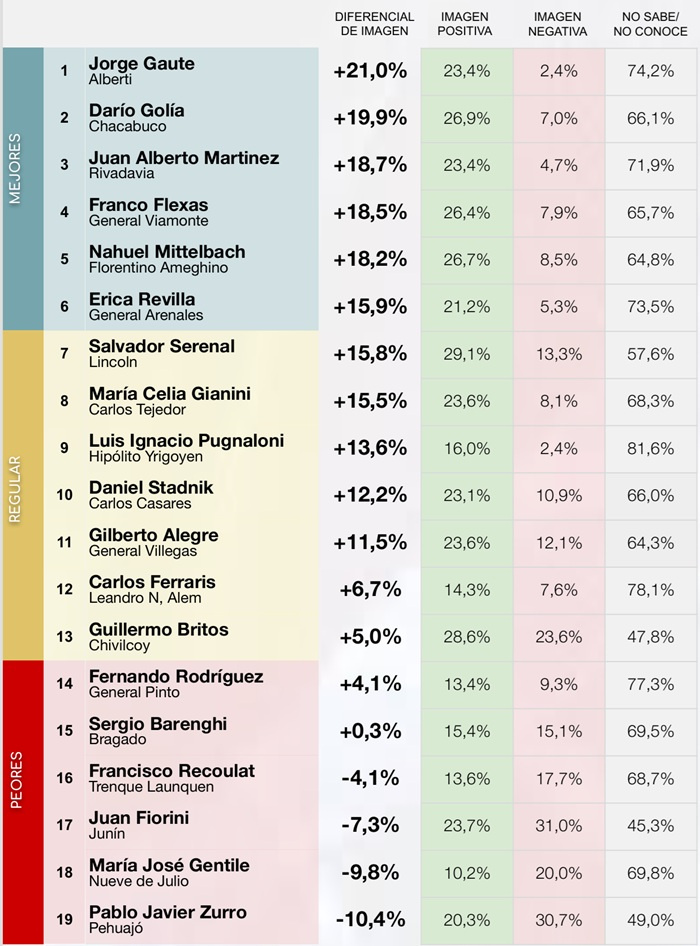 En el otro extremo del ranking se ubican los intendentes con peor diferencial de imagen en la sección. En último lugar aparece Pablo Javier Zurro (Pehuajó), con un diferencial de -10,4 puntos porcentuales; seguido por María José Gentile (Nueve de Julio), con -9,8 puntos; y Juan Fiorini (Junín), con -7,3 puntos.