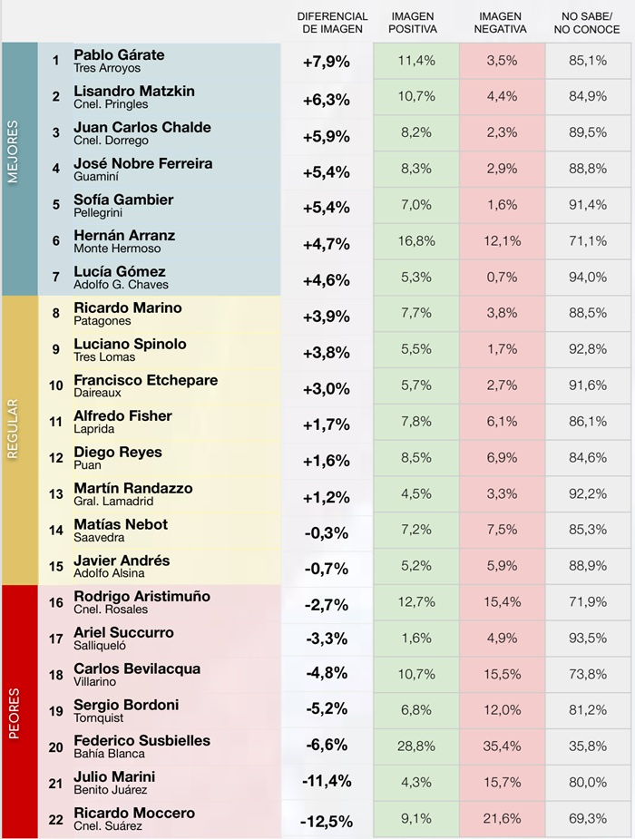 En el otro extremo del ranking se ubican los intendentes con peor diferencial de imagen en la sección. En último lugar aparece Ricardo Moccero (Coronel Suárez), con un diferencial de -12,5 puntos porcentuales; seguido por Julio Marini (Benito Juárez), con -11,4 puntos; y Federico Susbielles (Bahía Blanca), con -6,6 puntos.