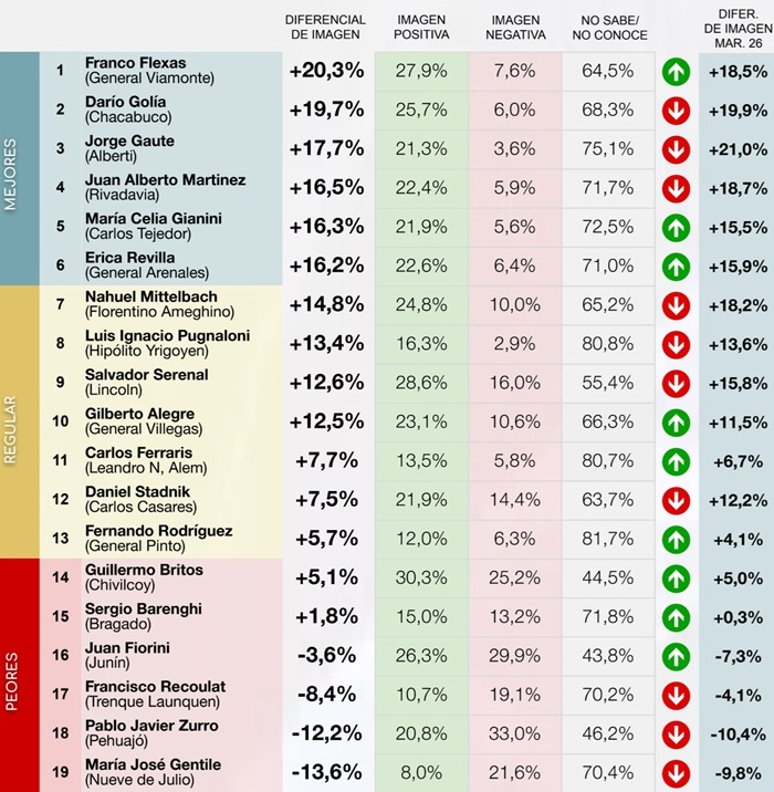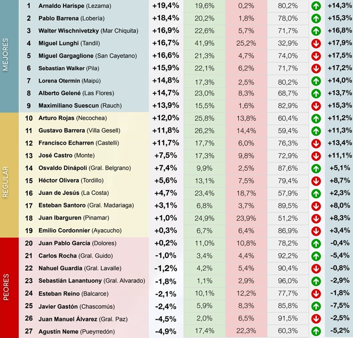 En el otro extremo del ranking, los intendentes con peor diferencial del mes son: en último lugar Agustín Neme (Pueyrredón) con -4,9 %, seguido por Juan Manuel Álvarez (General Paz) con -4,5 %, y luego Javier Gastón (Chascomús) con -2,4 por ciento.