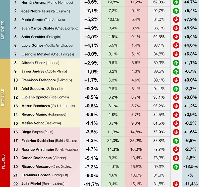 En el otro extremo del ranking, los intendentes con peor diferencial del mes son: en último lugar Julio Marini (Benito Juárez) con -11,7 %, seguido por Estefanía Bordoni (Tornquist) con -9 %, y luego Ricardo Moccero (Coronel Suárez) con -7,2 por ciento.
