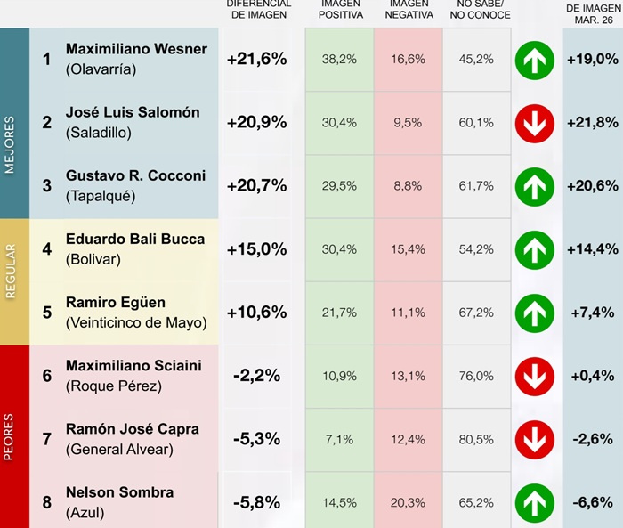 Los tres intendentes de la séptima sección electoral con mejor diferencial de imagen en este mes son: Maximiliano Wesner (Olavarría) con un diferencial de +21,6%, en primer lugar; seguido por José Luis Salomón (Saladillo) con +20,9%; y en tercer lugar Gustavo Rodolfo Cocconi (Tapalqué) con +20,7%.