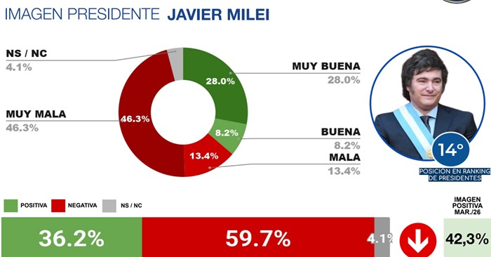 Una reciente encuesta de CB Global Data a nivel continental marca un notorio retroceso en la imagen del presidente Javier Milei, con casi 60 % de valoraciones de los ciudadanos argentinos entre “mala” y “muy mala”. De este modo, cayó en poco tiempo a estar entre los peores de la región.